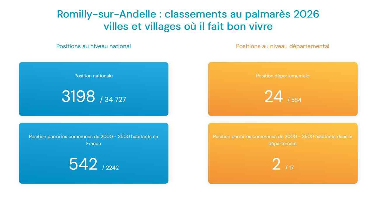 Cette année encore, Romilly-sur-Andelle est classé deuxième village où il fait bon vivre dans la catégorie des communes de 2 000 à 3 500 habitants dans le Département de l’Eure. À l’échelle nationale, le village se classe 542e sur 2 242 localités de strate équivalente.
